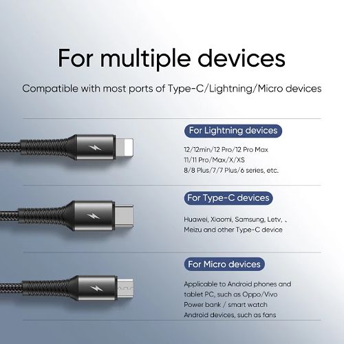 Introducing the JOYROOM S-01530G9 - 3in1 Short Charging Cable 3.5A -0.15M - Black. This stylish cable is perfect for charging three devices simultaneously. It features a lengthened soft rubber SR, resistant to 10000 of bending tests, and a nylon braided design for tensile strength and wear-resistance. With a 3.5A fast charging current, this cable is compact and portable. Specifications include a model number of S-01530G9, a name of 3in1 short charging cable, a function of charging, a current of 3.5A (Max), a length of 15CM, a material of aluminum alloy + nylon braided, a color of black, and a net weight of 20g.