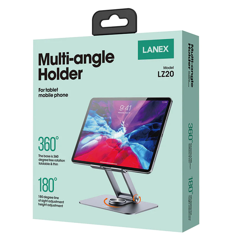 Introducing the Lanex Lz20 Aluminum Alloy Desktop Phone Holder, the perfect accessory for your desk. This stylish holder is made from durable aluminum alloy and features a multi-angle design for easy viewing of your tablet or mobile phone. The base is 360 degree free rotation, foldable and thin, and can be adjusted to a 180 degree line of sight. Height adjustment is also available for added convenience.